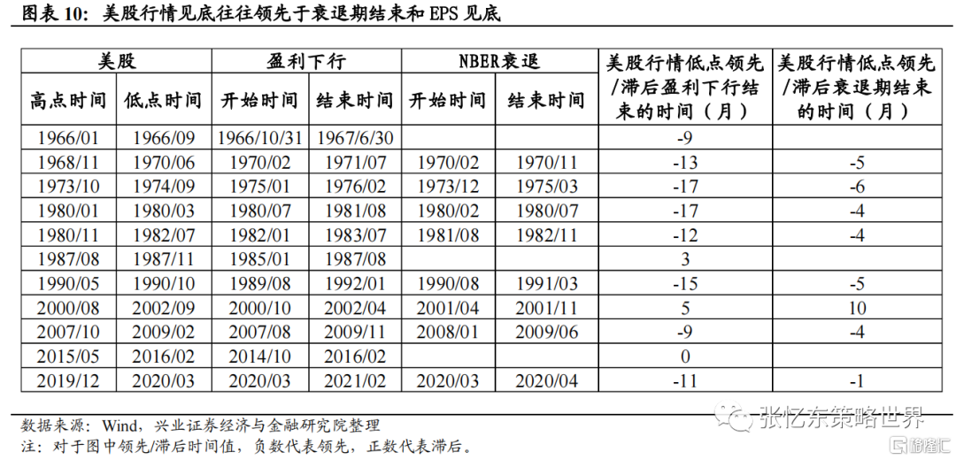 美股行情见底往往领先于衰退期结束,领先于EPS见底。美股行情低点出现的时间领先于衰退期结束约4-6个月,平均领先于美股EPS见底约3个季度。