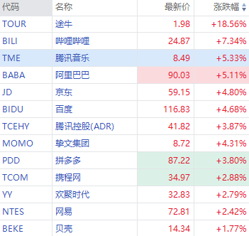 华盛资讯12月27日消息,热门中概股盘初拉升,哔哩哔哩涨超7%,阿里巴巴、腾讯音乐涨超5%,京东、百度涨超4%,拼多多涨超3%。中概旅游股大涨,出入境政策优化,春节出境跟团游产品搜索量飙升,途牛涨超18%,携程网涨近3%。