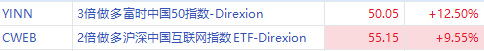 ETF方面,3倍做多富时中国50指数ETF $YINN 涨超12%,2倍做多沪深中国互联网指数ETF $CWEB 涨超9%。