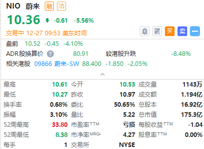 蔚来 $NIO 跌幅扩大超5%,此前蔚来将第四季度交付预期下调至3.85万-3.95万辆。