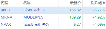 美国抗疫概念股走低,BioNTech SE跌超5%,诺瓦瓦克斯医药、MODERNA跌超4%。