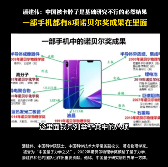 中国科学院院士潘建伟曾提到过这个问题,他在此前的一次演讲中表示,一部手机至少应用了八项诺贝尔奖成果,凝聚了很多基础物理和基础化学的技术,而它们都是几十年前的研究成果。比如,半导体的成像器件就源自2009年的诺贝尔物理学奖,集成电路源自2000年的诺贝尔物理学奖。