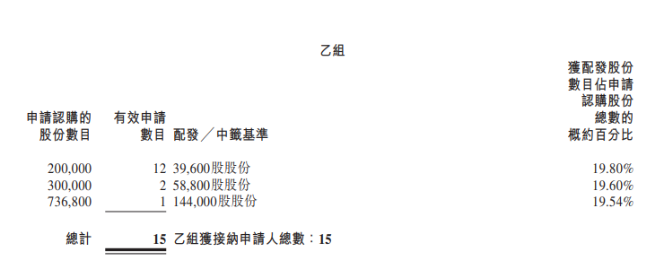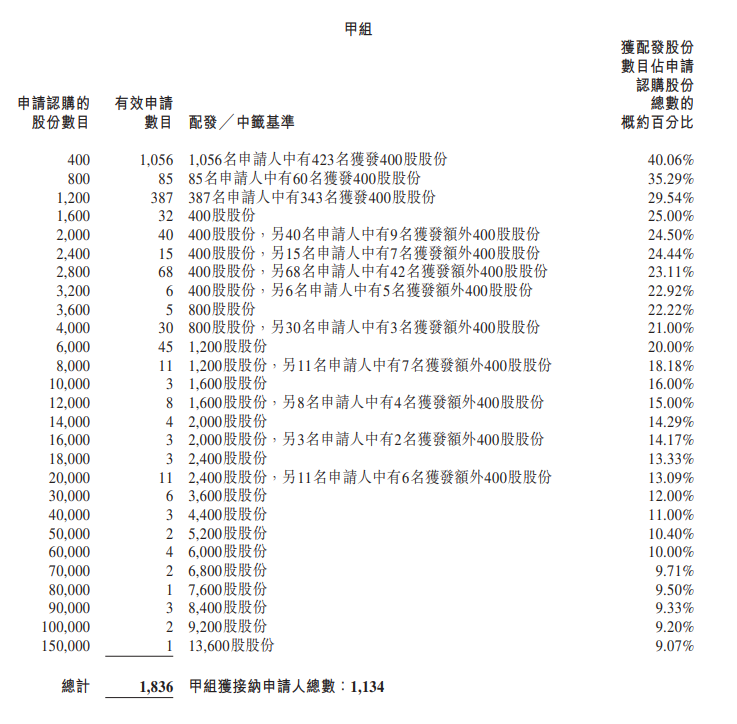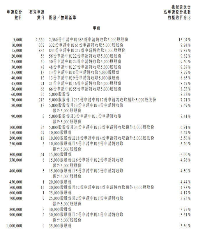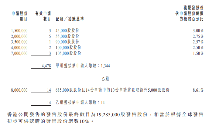 香港公开发售项下初步提呈发售的香港发售股份已获小幅超额认购。根据香港公开发售接获合共1851份有效申请,认购合共754.84万香港发售股份,相当于香港公开发售项下初步可供认购发售股份总数147.36万股的约5.12倍。