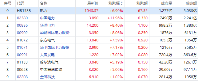 12月28日讯,港股绿色电力板块强势走高,华电国际电力、中国电力涨超6%,大唐发电、新奥能源涨超5%。