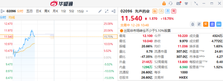 12月28日讯,先声药业(02096)早盘大涨超15%,报11.54港元,成交额4.77亿港元,公司新冠口服药完成三期临床,预计最快明年2月上市。
