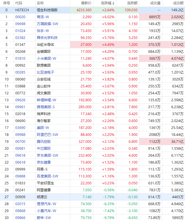 科网股走强,商汤-W涨超6%,快手-W、万国数据-SW涨超5%,小米集团-W涨超4%,美团-W、阿里巴巴-SW、腾讯控股现涨超2%。
