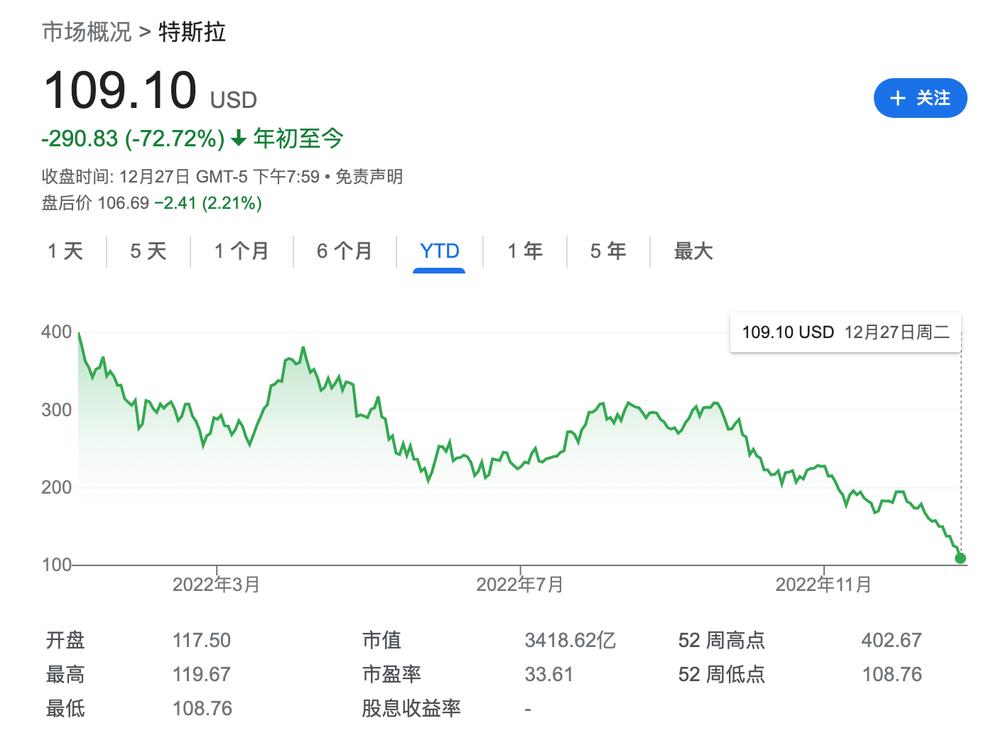 仅12月,特斯拉股价就暴跌逾40%,迈向有史以来最糟糕的一个月,而今年以来该股已经下跌逾70%,势将创下最差年度表现。