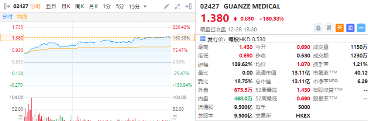 华盛资讯12月28日讯,医学影像供应商GUANZE MEDICAL暗盘收涨160.38%,一手账面浮盈4250港元,最新总市值超13亿港元。