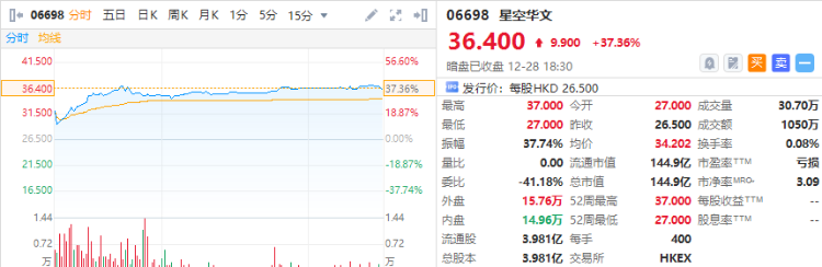 综艺IP运营商星空华文收涨37.36%,一手账面浮盈3960港元,最新总市值144.9亿港元,以上两只新股预计将于明日(12.29)正式挂牌上市。