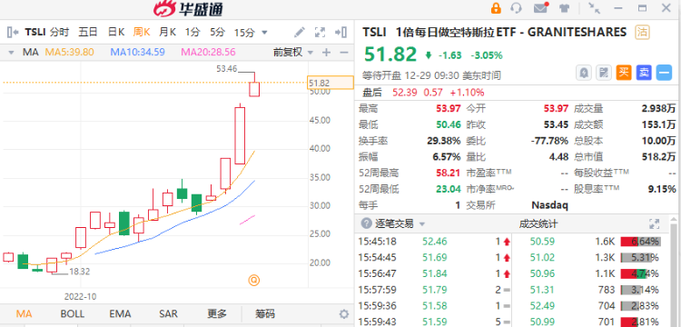 1倍每日做空特斯拉ETF $TSLI  本周大涨9.19%,连续4周录得上涨。马斯克和他的特斯拉,正在泥沼中越陷越深。本周二,特斯拉股价收于109.10美元,下跌14.05美元,跌幅达到了11.41%,是自2020年8月13日以来的最低收盘价。今年到目前为止,特斯拉股价已下跌了69%,较2021年11月的历史高点下跌了73%。特斯拉也因此两年多来首次跌出市值最高的美国上市公司TOP10。12月,特斯拉暴跌44%,是有史以来最糟糕的一个月,此前从未在一个月内跌幅超过25%。也就是说,本月特斯拉已创下了最差月份、最差季度以及最差年度的记录 。
