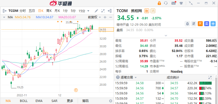 携程网本周累计上涨1.65%。国家卫健委26日晚发布《关于对新型冠状病毒感染实施“乙类乙管”的总体方案》,取消入境后全员核酸检测和集中隔离,有序恢复中国公民出境旅游。野村发研报指,防疫措施放宽,这或有助于推动跨境旅游行业的复苏 。该行业在过去三年受到打击,而跨境旅游的市场领导者携程可能成为最新政策的主要受惠者。该行提到,出境旅游占疫情前携程总收入的约25%,而2022年第三季约为3%,在被压抑的旅行需求支持下,料由2023年初起会有显著改善。该行料携程的出境业务可能会在2023年反弹至疫情前水平的约40% 。