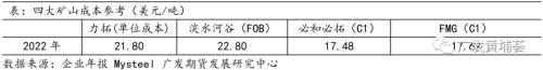 四大矿山生产成本来看,成本均维持在23美元以下,考虑到运费均值在25美元以下,主流矿到中国港口成本维持在50美元以下。