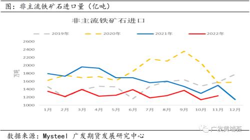 22年受地缘政治冲突与贸易因素影响,非主流铁矿石供应偏弱运行。我国1-11月非主流铁矿石进口量为1.4亿吨,同比下降4235.02万吨。