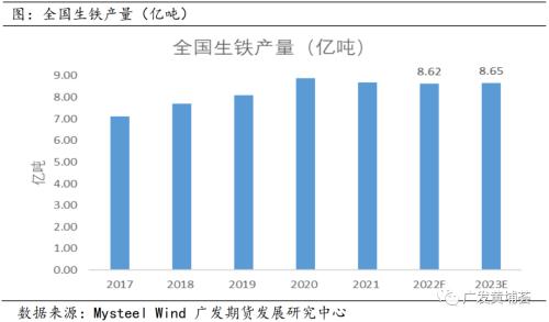 2022年前11月生铁产量同比下降671.8万吨至7.9亿吨。考虑去年12月份高基数,预计22年生铁产量为8.62亿吨,同比下降700万吨。上半年,两会与残奥会后,钢厂复产继续带动铁矿石需求上升,日均铁水产量于6月份达到峰值243万吨;6-7月,利润持续亏损倒逼钢厂检修停产,铁水产量一度下降至214万吨,较上半年峰值下降29万吨。随着钢厂逐步复产,铁水产量再次上升,叠加冬季限产影响较小,目前维持在222万吨水平。23年预估粗钢和生铁产量10.36亿吨和8.65亿吨,同比分别增长2800万吨(+2.8%)和300万吨(+0.4%),铁水增幅低于粗钢。一方面,明年行政限产预期较小,钢厂产量易增难减;另一方面,预计明年废钢供应逐步恢复,铁水对废钢替代作用将有所下降,铁钢比从0.85下降至0.84。