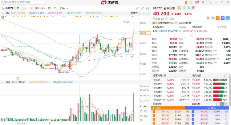 - 12月29日,新冠创新药临床试验报告显示,相较于辉瑞Paxlovid,君实生物VV116的临床恢复时间更短,安全性方面的顾虑更少。君实生物港股当日盘中拉涨超17%,股价高见45港元。