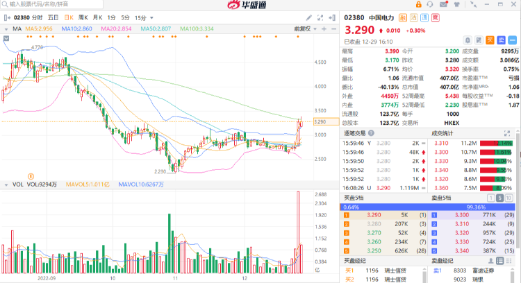 - 此外,据联交所数据,12月22日,中国电力获国家电力投资集团在场内以每股均价2.7356港元增持632.1万股,涉资约1729.17万港元。增持后,国家电力投资集团持股比例由60.02%上升至61.01%。