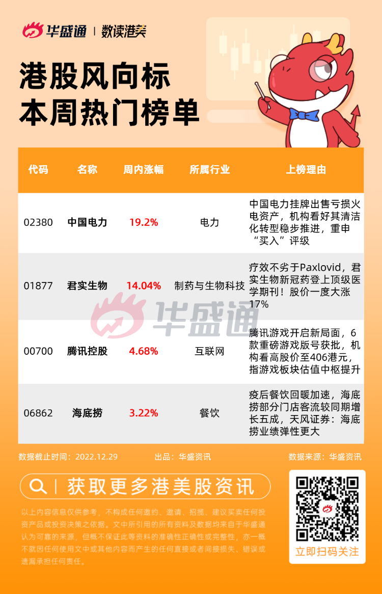 - 此外,11月以来,科网股股价显著回弹,同时互联网行业监管正逐渐回归常态化,行业迎来降本增效带来的利润端拐点。海通国际表示,随着经济基本面改善、头部平台降本增效的持续释放,持续关注港股互联网板块,重点推荐腾讯 $00700.HK 。