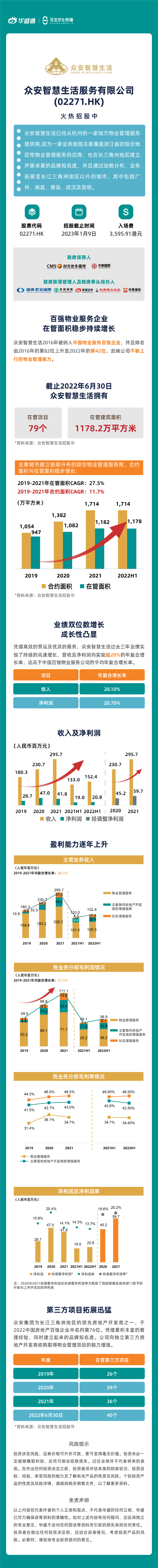 综合物业管理服务商:众安智慧生活(02271)今起招股,前往认购。拟全球发行约1.27亿股,其中香港发售约占10%,全球发售约占90%;每股发售价介乎1.38-1.78港元,每手2000股,入场费3595.91港元;招商证券国际及中泰国际为联席保荐人,预期股份将于2023年1月16日挂牌上市。带你一图看懂: