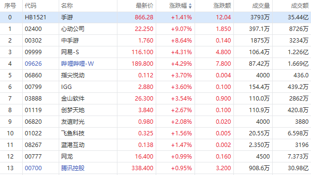 游戏股早盘继续走高,截至发稿,心动公司涨9.07%,中手游涨8.64%,网易-S、哔哩哔哩-W涨超4%,腾讯现涨0.95%,报338.4港元。