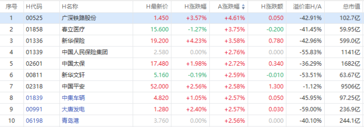 截至发稿,新华保险A股涨3.58%,H股现涨4.23%;广深铁路股份A股涨4.61%,港股涨3.57%;中国太保A股涨2.72%,H股涨1.98%。