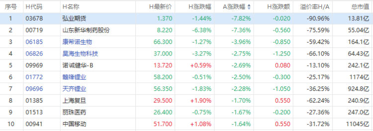 山东新华制药股份A股跌7.36%,H股跌6.38%;弘业期货A股跌7.82%,H股跌1.44%;康希诺生物A股跌3.96%,H股跌1.27%。
