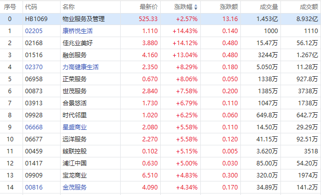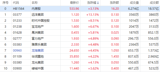 12月30日讯,港股内房、物管股尾盘快速拉升,截至发稿,远洋集团、融创服务涨超13%,时代中国控股涨超8%,世茂服务涨7.58%,合景悠活涨超6%,龙湖集团、华润置地涨超4%。