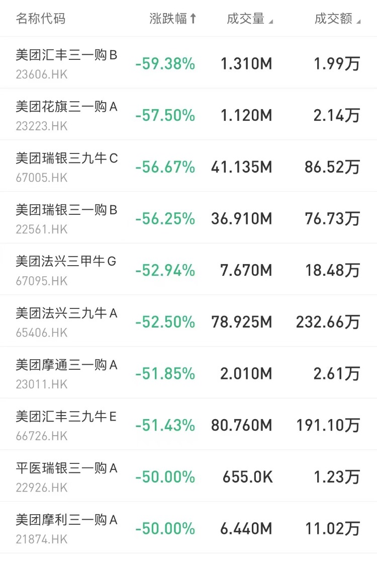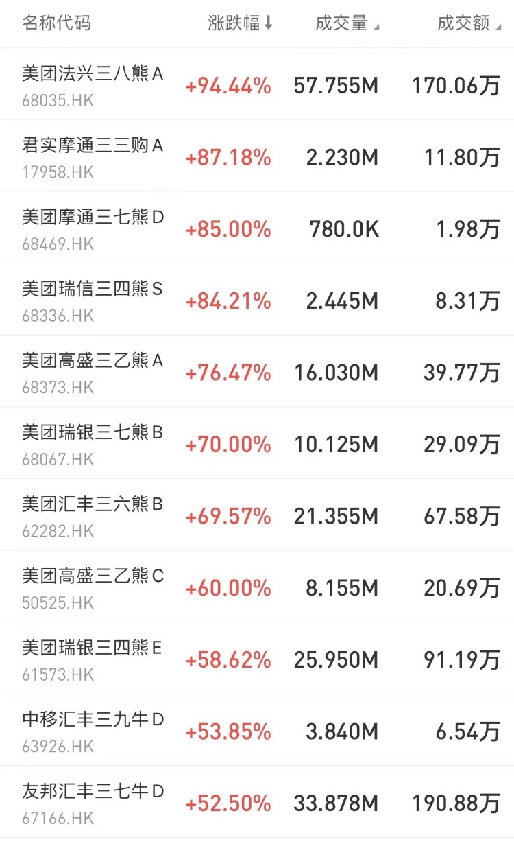 编者按:今日所有窝轮牛熊证合计成交79.22亿港元,占大市成交9.11%,美团法兴三八熊A涨94.44%。