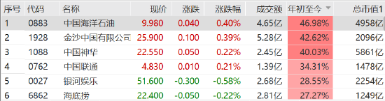 蓝筹股方面, 今年以来,中国海洋石油大涨47%,领涨蓝筹,金沙中国、中国神华等涨超40%,银河娱乐、海底捞涨近30%,舜宇、碧桂园等跌超60%。