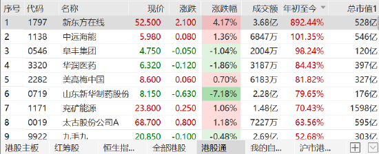 港股通来看,新东方在线暴涨892.44%,中远海能涨超100%、阜丰集团涨超98%,华润医药、新华制药等涨80%,多只小型内房股暴跌,天誉置业、佳源国际控股等跌超90%,处于破产传闻风波中的国美零售跌超80%,造车新势力小鹏也跌近80%。