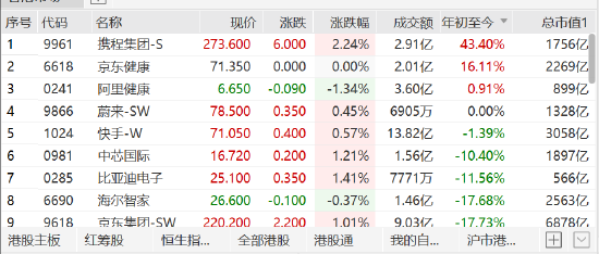 恒生科技指数成份股多数下跌,携程集团大涨43%领涨,京东健康涨超16%,小鹏跌79%领跌,小米跌超40%,阿里、腾讯等跌超20%。