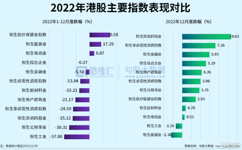 回看过去一年,恒指年初走高,突破25000点,此后一路下跌,10月一度跌破15000点。随着疫情管控放松、地产流动性支持等各类政策放松的刺激,11月后,恒指暴力反弹,开启了一轮底部估值修复。截至12月30日收盘,恒指年跌幅15.46%、恒生科技指数和国企指数分别下跌27.19%、18.59%。