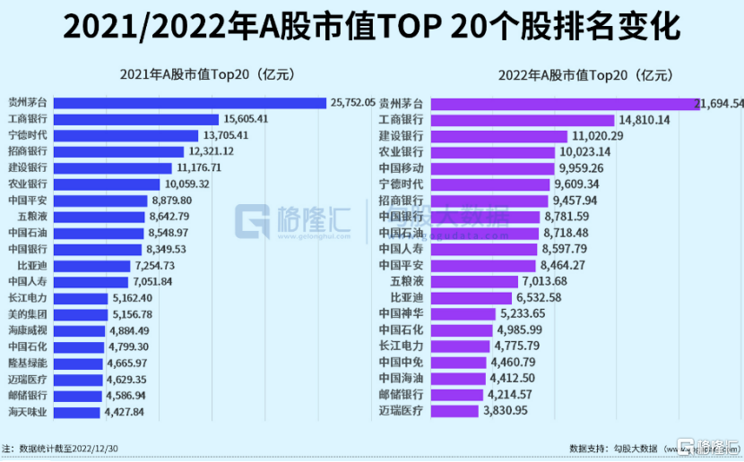 按最新收盘价算,贵州茅台、工商银行、中国移动、建设银行、中国人寿、农业银行、宁德时代、招商银行、中国银行、中国石油的总市值排名A股前十。
