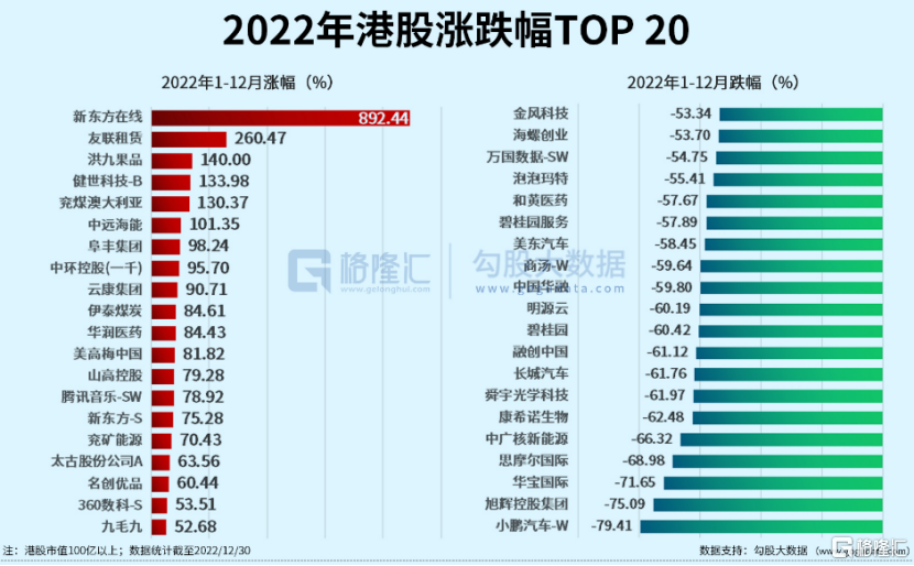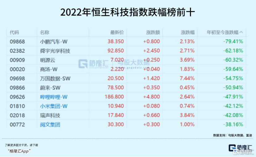恒生科技指数全年跌27.19%,成份股中,小鹏跌超79%领跌,舜宇光学科技科技、明源云跌超60%,小米跌超40%,阿里、腾讯等跌超20%。