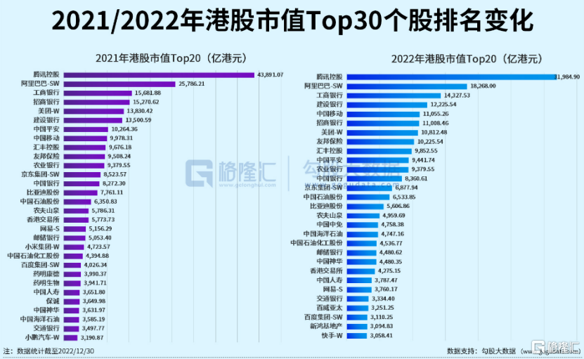 与去年相比,腾讯控股稳居第一,总市值超3.19万亿港元;阿里巴巴、工商银行紧随其后,位居二、三名。