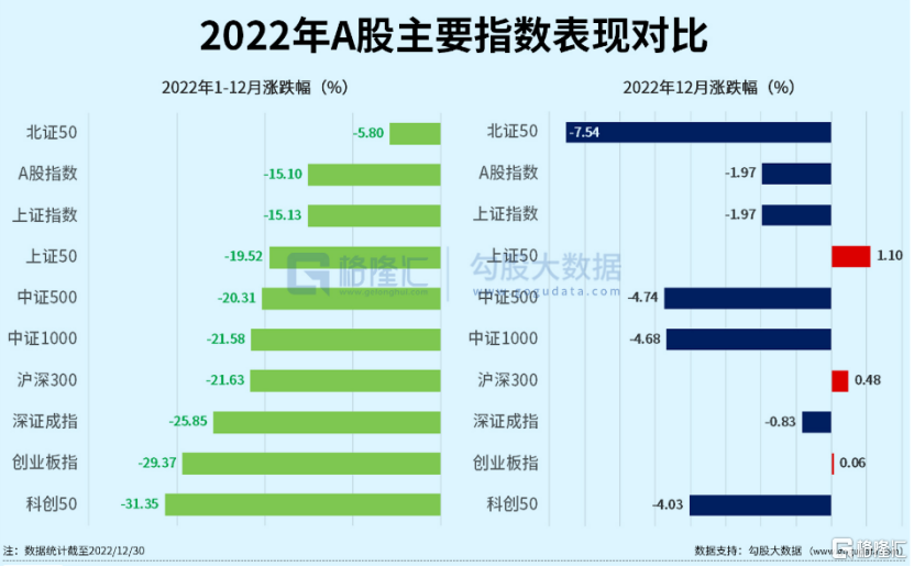 回看过去一年,A股市场走出“W”的走势,沪深两市三大指数出现不同程度的下跌。截至12月30日收盘,上证指数年跌幅15.13%、深成指和创业板指分别下跌25.85%、29.37%。