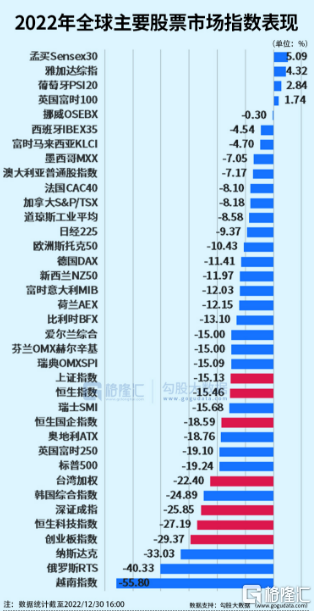 总得来看,这一年全球市场阴霾笼罩,主要股指跌多涨少。其中,取得1997年来最快GDP增速(8.02%)的越南股市创下年度最糟糕的表现,年内跌幅超55%。俄罗斯指数位居跌幅榜第二位年内累跌超40%,美股同样表现不佳,纳指年内暴跌33%。