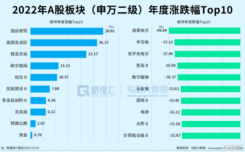 行业方面,消费、顺周期两大行业表现优异。其中,酒店餐饮、旅游及景区、煤炭开采等板块位居涨幅榜前三。消费电子、半导体、光学光电子跌幅最多,分别下跌40.44%、37.11%、37.04%。
