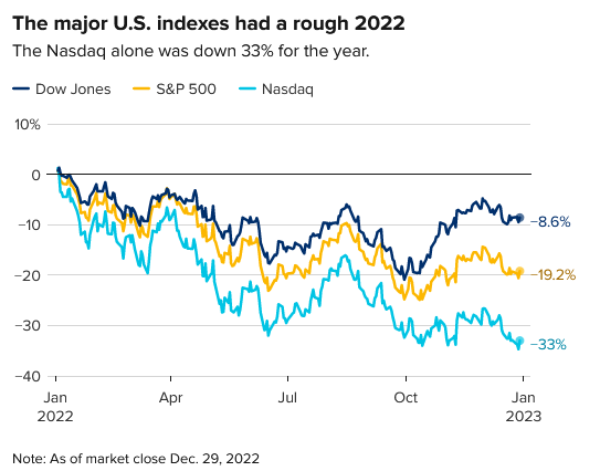 美股三大股指均将录得2008年以来的最差年度表现,并结束此前连续三年上涨的行情。截止周四收盘,道指已下跌8.58%,标普500指数下跌19.24%,而以科技股为主的纳指则下跌了33.03%。