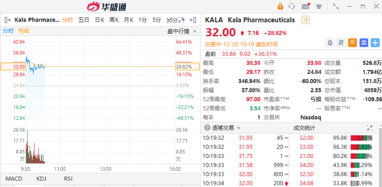 华盛资讯12月30日消息,美股盘初,药物制造商Kala Pharmaceuticals逆市大涨,截至发稿,KALA涨逾28%,报32美元。值得关注的是,该股周内涨超700%。