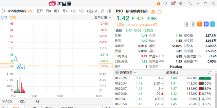 医药股多数下挫,截至发稿,INO跌超7%,报1.42美元。BNTX跌超3%,Moderna、Ocugen跌超1%。