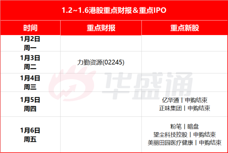 下周港股重点财报主要包括:力勤资源(周二)。新股方面,目前有十只新股正在认购中,亿华通、正味集团、望尘科技控股、美丽田园医疗健康下周认购结束,粉笔周五公布中签结果。