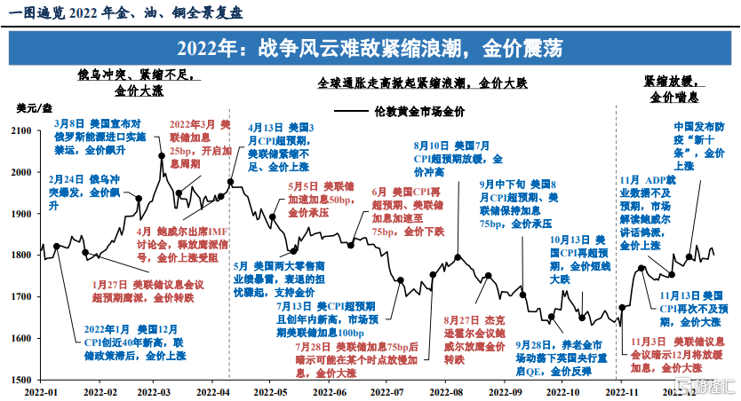 回顾2022年,金价大起大落,但经受住了紧缩狂潮的冲击。年初在俄乌冲突的加持下金价一度站上2000美元/盎司,第三季度在欧央行为控通胀、不断加速加息的影响下,金价也一度跌至1618美元/盎司的低点,年末则在美联储放缓加息、中国加速优化防疫的作用下金价反弹至1800美元/盎司上方,全年累计仅下跌0.3%。纵观全年,可以分为三个阶段: