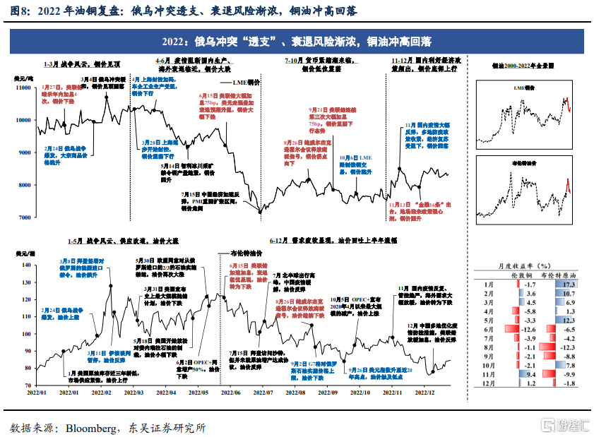 2022年下半年,铜价更早迎来反弹,中国“底色”依旧更浓。疫情三年,市场一度怀疑铜价可能与中国脱钩,但是从2022年的经验看铜的中国底色依旧很浓。尤其是下半年,在欧美央行不断加速紧缩下,原油价格一直在刷新年内低位,而铜价在7月触底后进入盘整,第四季度在国内地产政策继续加力、疫情防控不断优化下,铜价甚至出现了明显的反弹。铜、油的这一分化再次凸显了铜价背后中国政策因素的重要作用。