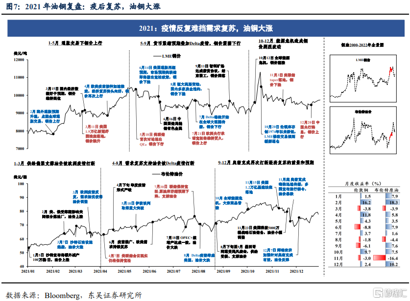 回顾2022年,从铜、油等商品的走势上我们学到了两条重要的启示。第一条是关于事件冲击的作用——重大事件的爆发往往是行情加速见顶(或者见底)的催化剂,如果说2022年3至4月疫情爆发加速商品价格见底,那么2022年2至3月俄乌冲突的意外爆发则使得价格高点提前来临。此外,对于供需因素的评估——供给端往往是长期因素(比如投资不足),以年度(或者更短的时间)为维度,需求因素的边际影响可能更大。疫情三年,商品投资不足的问题并未得到根本解决,但是2022年和2021年商品的行情大相径庭,背后的重要原因就是需求的强弱不同——尽管库存都处于较低水平,但2022年市场担心的是衰退,而2021年市场的主题则是复苏。
