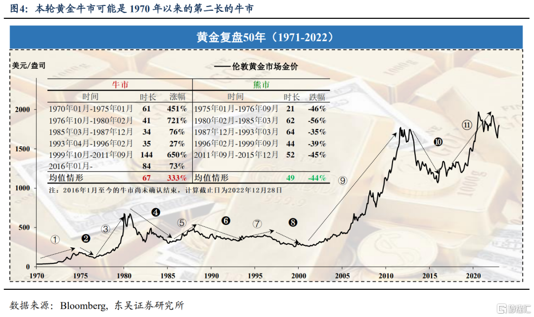 疫情三年,本轮黄金牛市似乎仍未结束。至2022年12月,本轮黄金牛市已经持续了84个月,是1970年以来历时第二长的牛市,不过收益率却不尽如人意,截至2022年12月28日累计涨幅仅达73%。值得注意的是,2020年8月之后,金价主要在1700至2000美元/盎司之间震荡了两年多的时间。