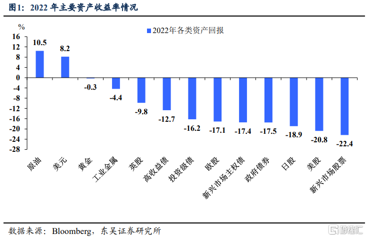 2022年可能是疫情三年以来,经济和市场最动荡的一年,但也是大宗商品的又一个大年。回顾2022年,我们见证了俄乌冲突以及背后的地缘政治剧变,也目睹了美联储40年来最迅猛的加息浪潮;我们亲历了中国经济在疫情反复中负重前行,也感受着全球经济在衰退的泥淖里举步维艰。毫无疑问,这是市场跌宕起伏的一年,而大宗商品再次经受住了“疾风暴雨”,在主要大类资产中,原油(以布伦特原油为代表)领衔大宗,依旧取得超过10%的正收益!而黄金和工业金属的表现在一众动辄两位数跌幅的权益、债券资产中也算不俗。
