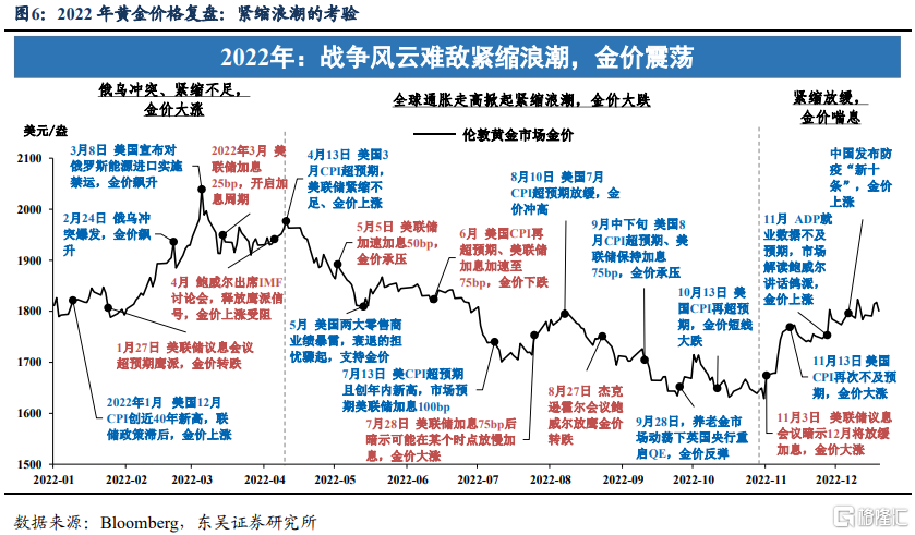 第一阶段:俄乌冲突+紧缩不足,金价大涨(1月至4月)。基本面上最大的冲击是俄乌冲突的意外爆发,以及欧美对于俄罗斯史无前例的制裁,3月8日拜登宣布对俄罗斯能源实施进口禁运,将金价推上2000美元/盎司的高位;政策层面,尽管通胀数据屡屡超预期,但是美联储紧缩不足(仅在3月加息25bp)。