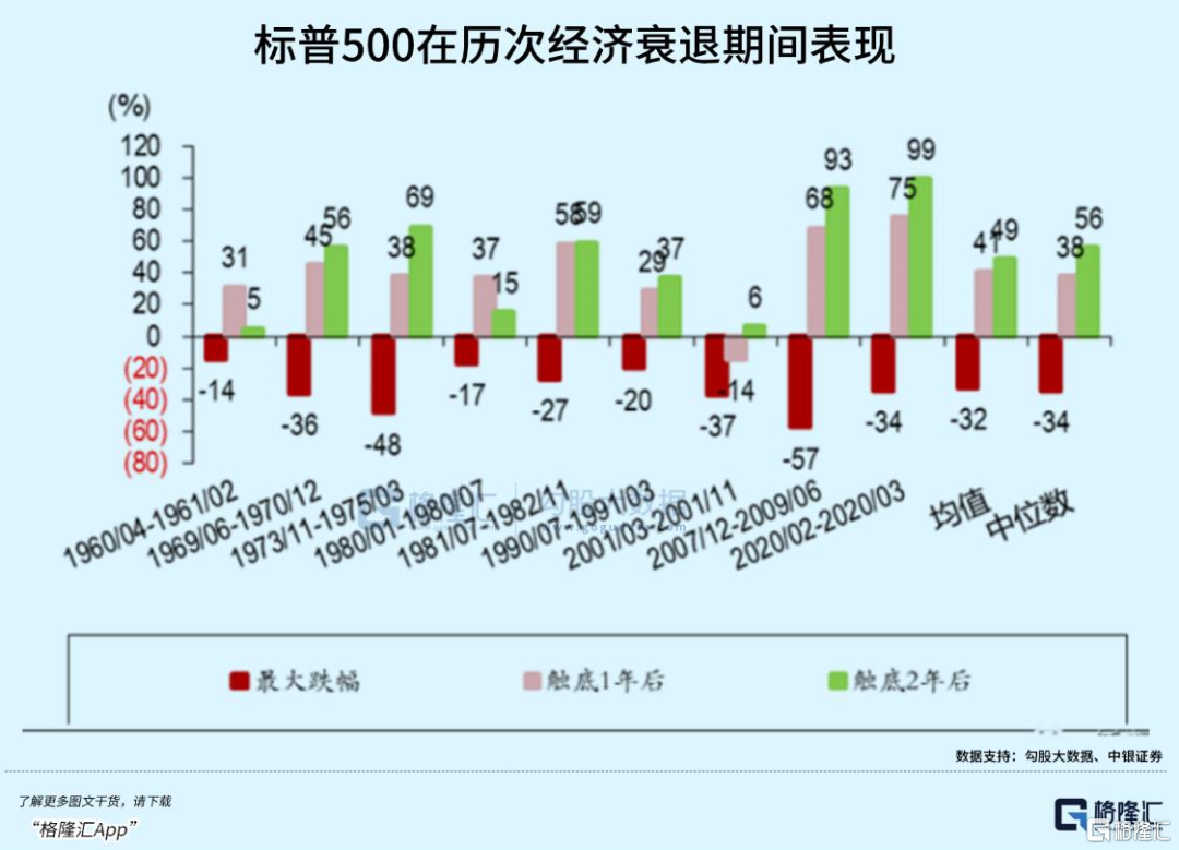 1960年代以来,美国经济一共经历了9次经济衰退,其中有3次深度衰退,即1973年、2008年以及2020年。标普500跌幅分别高达48%、57%、34%。轻微衰退中,最小跌幅为14%、最大跌幅也有36%。加总历次衰退,标普500指数下跌中位数为34%。