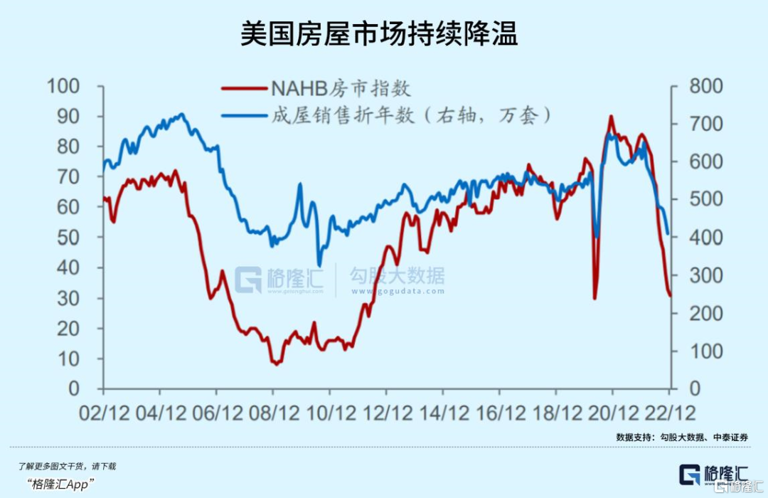 投资方面。12月制造业PMI仅为46.2,已经是连续第3个月大幅下滑,远远低于荣枯线的50。如果刨除2020年新冠刚爆发的异常值,目前制造业PMI至少创下2012年以来最低水平(2012年才有数据记录)。房地产市场,12月NAHB指数为31,为2020年4月以来新低,已是自去年12月触顶后的第12个月回落。可见投资这架经济马车也逐渐深陷被动之中。