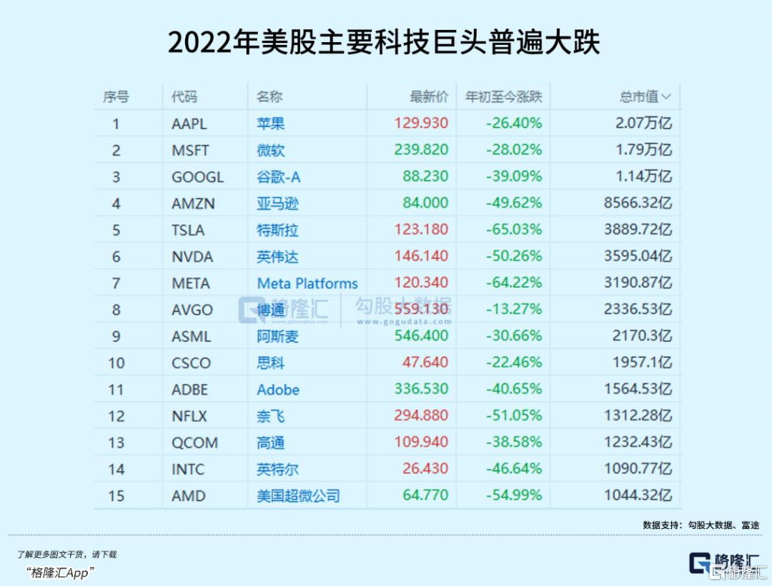 苹果、微软均大跌逾26%,谷歌大跌39%,亚马逊、奈飞暴跌50%左右,Meta暴跌64%。这6大科技巨头分别增发7400亿美元(单位,下同)、6900亿、3400亿、8400亿、1400亿、5700亿。加上特斯拉,7大科技巨头累计蒸发4.2万亿美元,折合29.4万亿人民币,蒸发了14个贵州茅台。